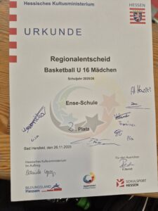Am 26.11.25 fand in Bad Hersfeld der Regionalentscheid Basketball statt.. Dabei belegten die Mädels der Ense-Schule Bad Wildungen den 2. Platz hinter dem Goethegymnasium Kassel. Die Badestädzerinnen qualifizieren sich damit für den Landesentscheid am 04.02.26 in Gelnhausen. Herzlichen Glückwunsch.
